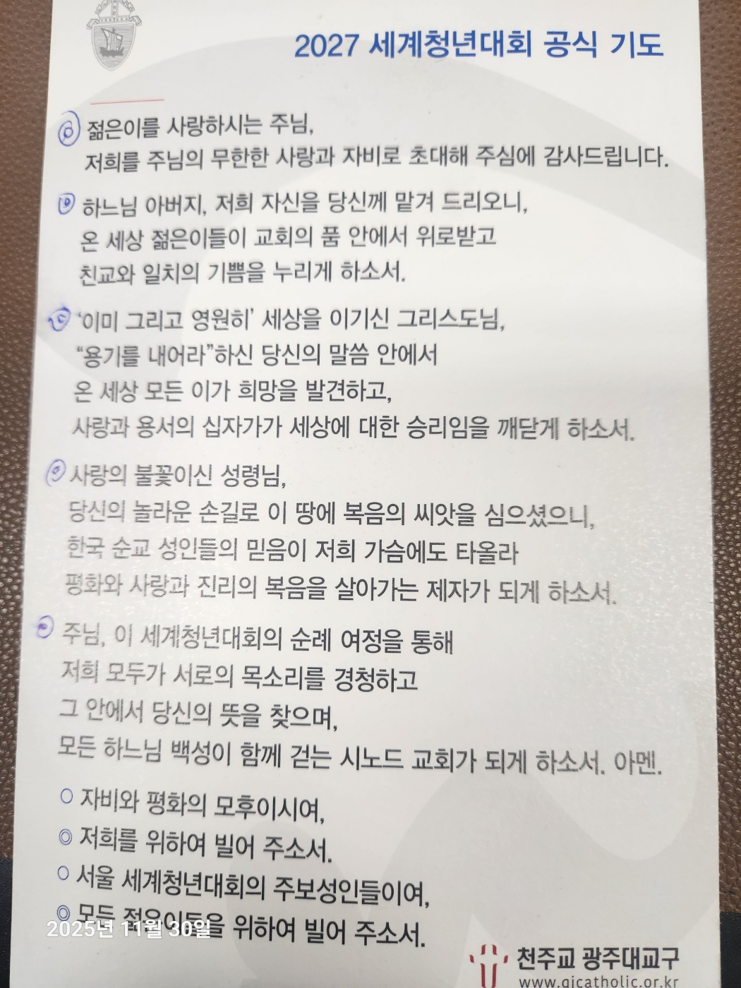 2027 세계청년대회 공식 기도문